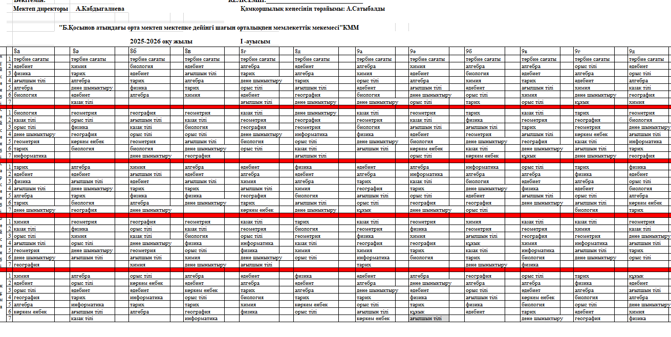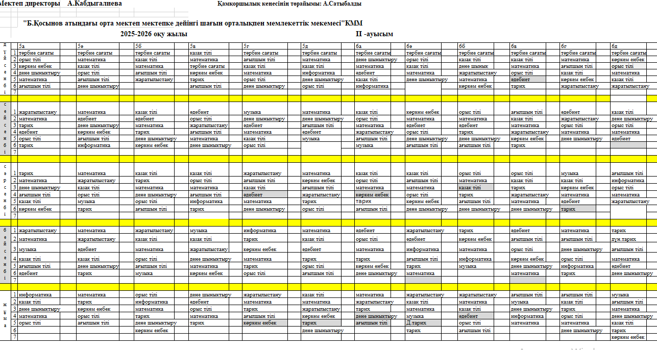Сабақ кестесі 2025-2026 оқу жылы 1 жартыдылдық » "Б.Қосынов атындағы орта мектеп мектепке дейінгі шағын орталықпен" КММ