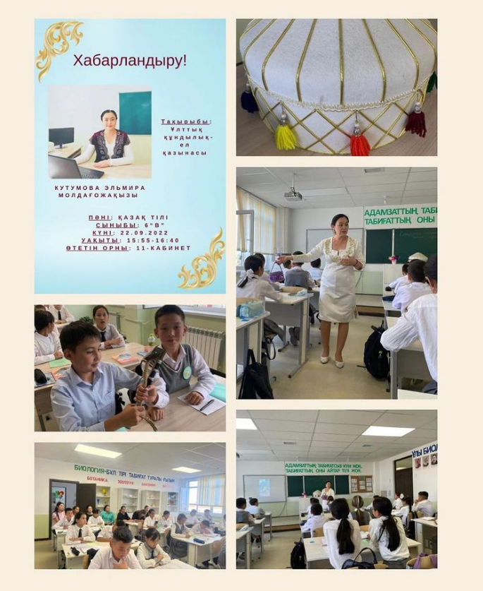 Б.Қосынов атындағы орта мектебімізде 6-«В» сыныбында Қазақ тілі пәнінен Кутумова Эльмира Молдағожақызы: «Ұлттық құндылықтар—ел қазынасы» атты ашық сабақ өтті.