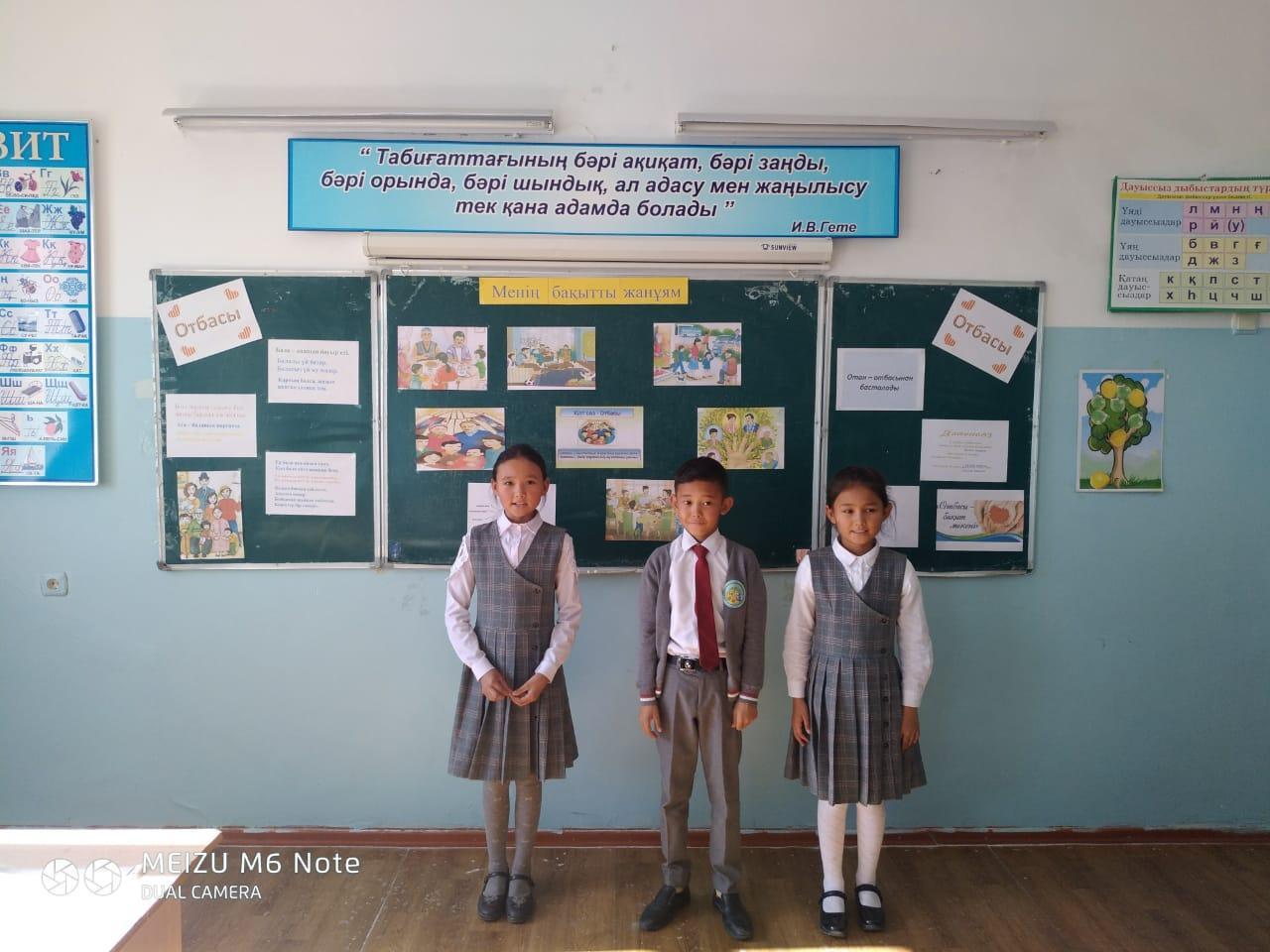 Қазақстан Республикасы Білім және ғылым министрлігінің 2019 жылы 24 қазан күні келген хаты негізінде мектебімізде 2019 жылы 25 қазан күні І ауысым оқушыларына сағат 12.00 де сынып сағаттары өткізілді. ІІ ауысым оқушыларына сағат 13:15 – те «Отбасы – тәрбие басы,мектеп-тәрбие жаршысы» бірыңғай сынып сағаттары өткізілді. 1-4 сыныптар арасында «Менің бақытты жанұям», «Бақытты адам өз үйінде бақытты» тақырыбында сынып сағаттары өтті.5-8 сыныптар арасында «Менің отбасымның тарихы», «Менің отбасымның фото-суреттегі тарихы», «Отбасымен, достарымен» тақырыбында сынып сағаттары өтті. 9-11 сыныптар арсында «Менің шежірем» , «Отбасының рухани құндылықтары», «Отбасылық альбомға көз салыңыз» атты өз отбасылары туралы әңгіме – презентация сынып сағаттары өткізілді.